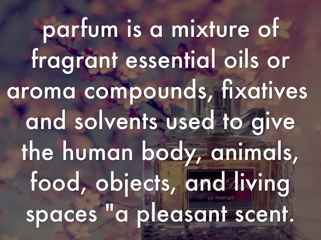 parfum is a mixture of fragrant essential oils or aroma compounds, fixatives and solvents used to give the human body, animals, food, objects, and living spaces "a pleasant scent.