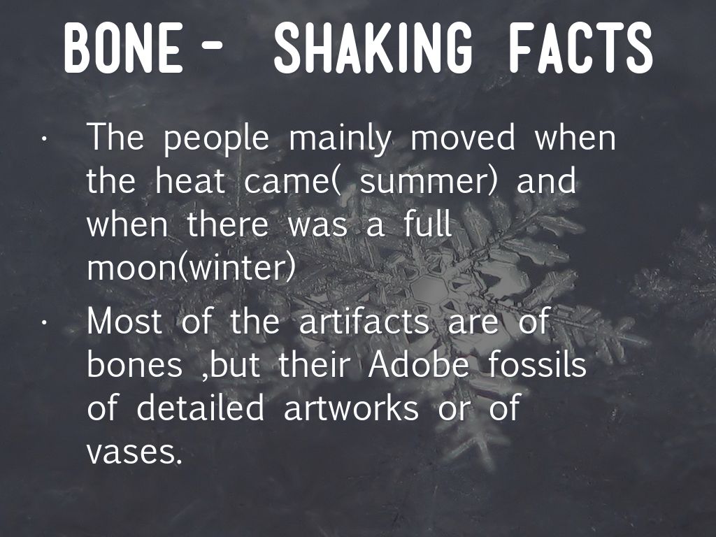 • Most of the artifacts are of bones ,but their Adobe fossils of detailed artworks or of vases.