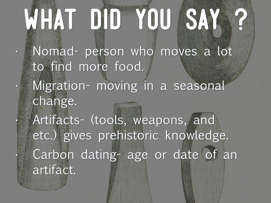 • Artifacts- (tools, weapons, and etc.) gives prehistoric knowledge.