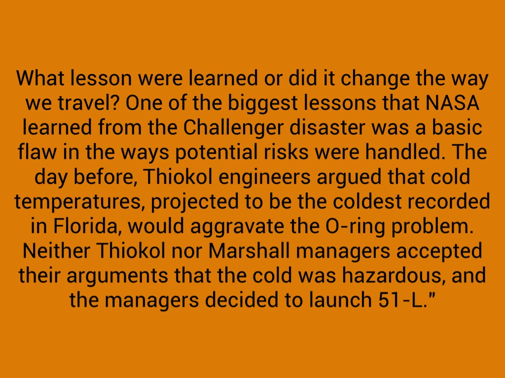 What lesson were learned or did it change the way we travel? One of the biggest lessons that NASA learned from the Challenger disaster was a basic flaw in the ways potential risks were handled. The day before, Thiokol engineers argued that cold temperatures, projected to be the coldest recorded in Florida, would aggravate the O-ring problem. Neither Thiokol nor Marshall managers accepted their arguments that the cold was hazardous, and the managers decided to launch 51-L."