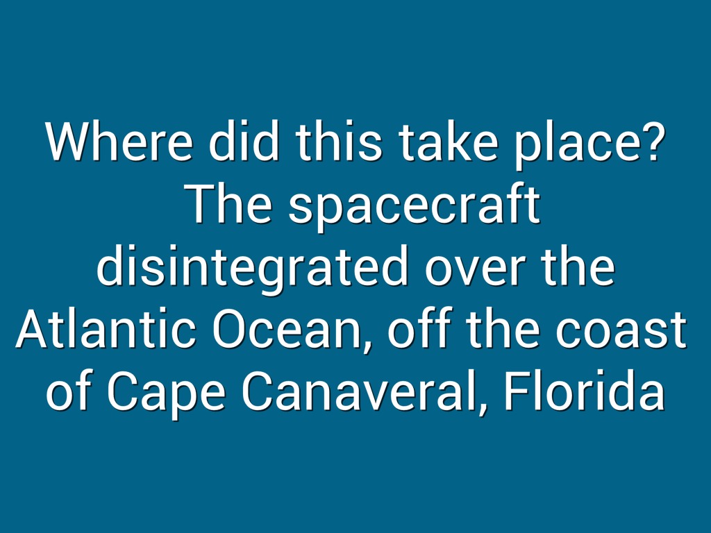 Exploded 73 sec. After liftoff, broke apart and disintegrated over the Atlantic Ocean. Seven died.