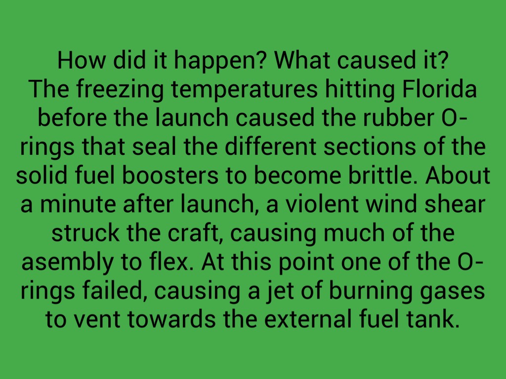 The freezing temperatures hitting Florida before the launch caused the rubber O-rings that seal the different sections of the solid fuel boosters to become brittle. About a minute after launch, a violent wind shear struck the craft, causing much of the asembly to flex. At this point one of the O-rings failed, causing a jet of burning gases to vent towards the external fuel tank.