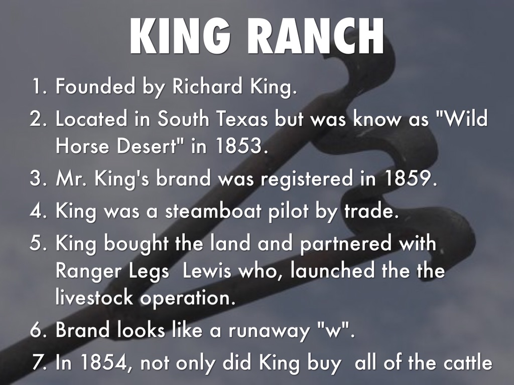 King bought the land and partnered with Ranger Legs Lewis who, launched the the livestock operation.