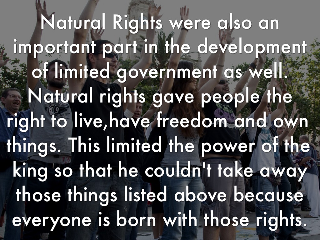 Natural Rights were also an important part in the development of limited government as well. Natural rights gave people the right to live,have freedom and own things. This limited the power of the king so that he couldn't take away those things listed above because everyone is born with those rights.