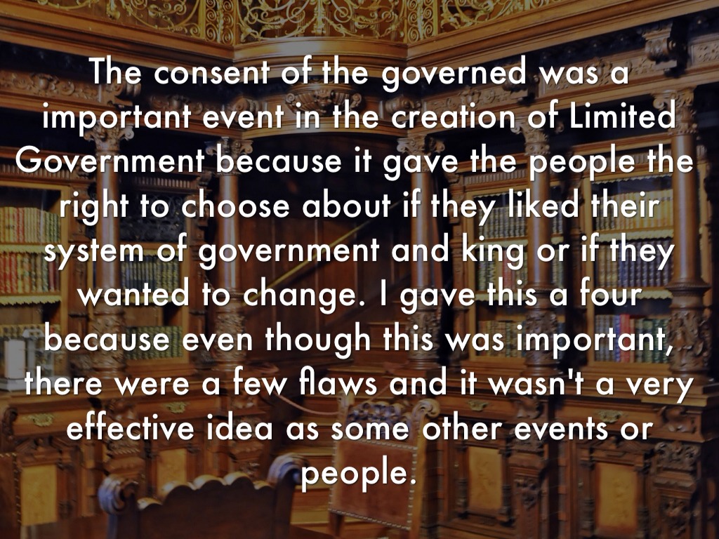 The consent of the governed was a important event in the creation of Limited Government because it gave the people the right to choose about if they liked their system of government and king or if they wanted to change. I gave this a four because even though this was important, there were a few flaws and it wasn't a very effective idea as some other events or people.