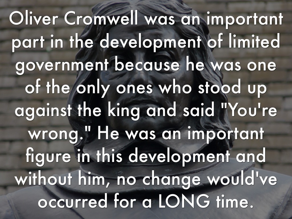Oliver Cromwell was an important part in the development of limited government because he was one of the only ones who stood up against the king and said "You're wrong." He was an important figure in this development and without him, no change would've occurred for a LONG time.