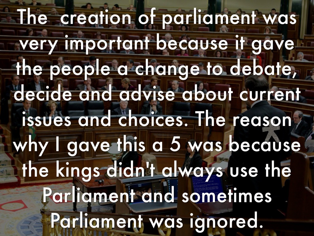 The creation of parliament was very important because it gave the people a change to debate, decide and advise about current issues and choices. The reason why I gave this a 5 was because the kings didn't always use the Parliament and sometimes Parliament was ignored.