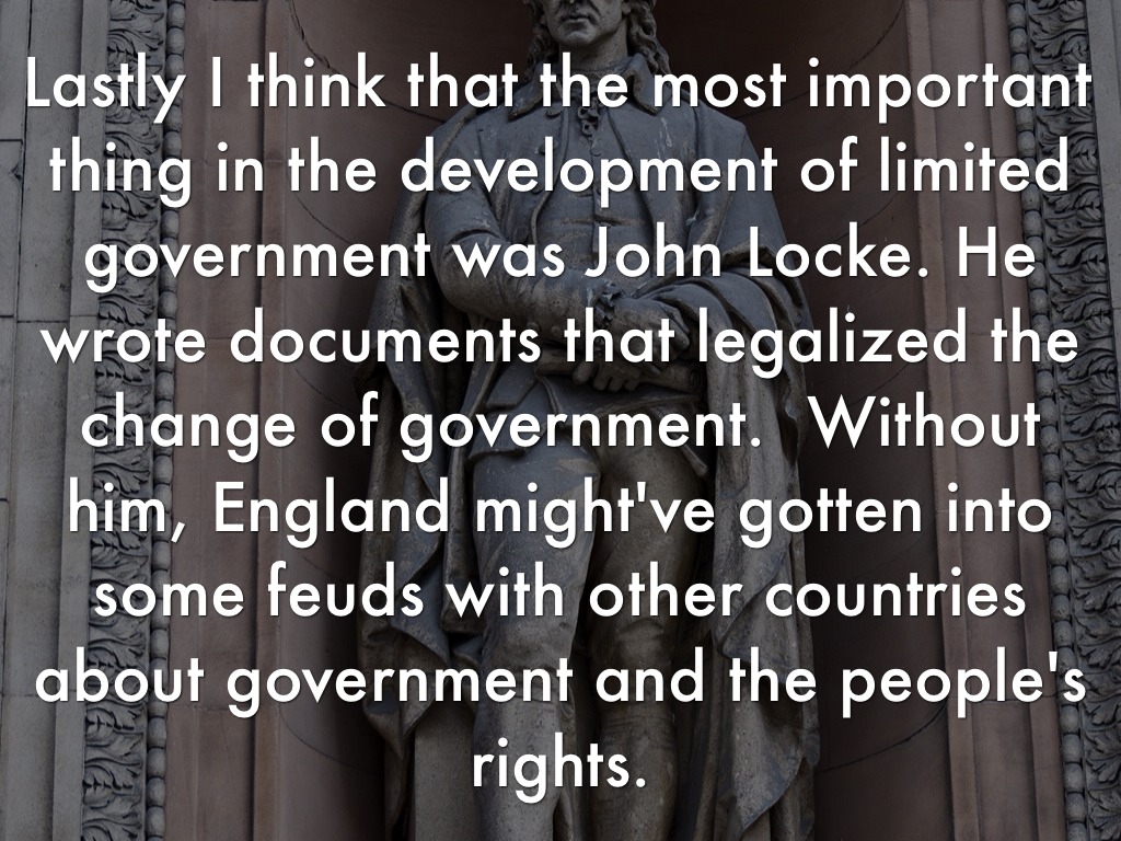 Lastly I think that the most important thing in the development of limited government was John Locke. He wrote documents that legalized the change of government. Without him, England might've gotten into some feuds with other countries about government and the people's rights.