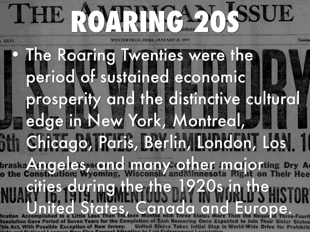 The Roaring Twenties were the period of sustained economic prosperity and the distinctive cultural edge in New York, Montreal, Chicago, Paris, Berlin, London, Los Angeles, and many other major cities during the the 1920s in the United States, Canada and Europe.