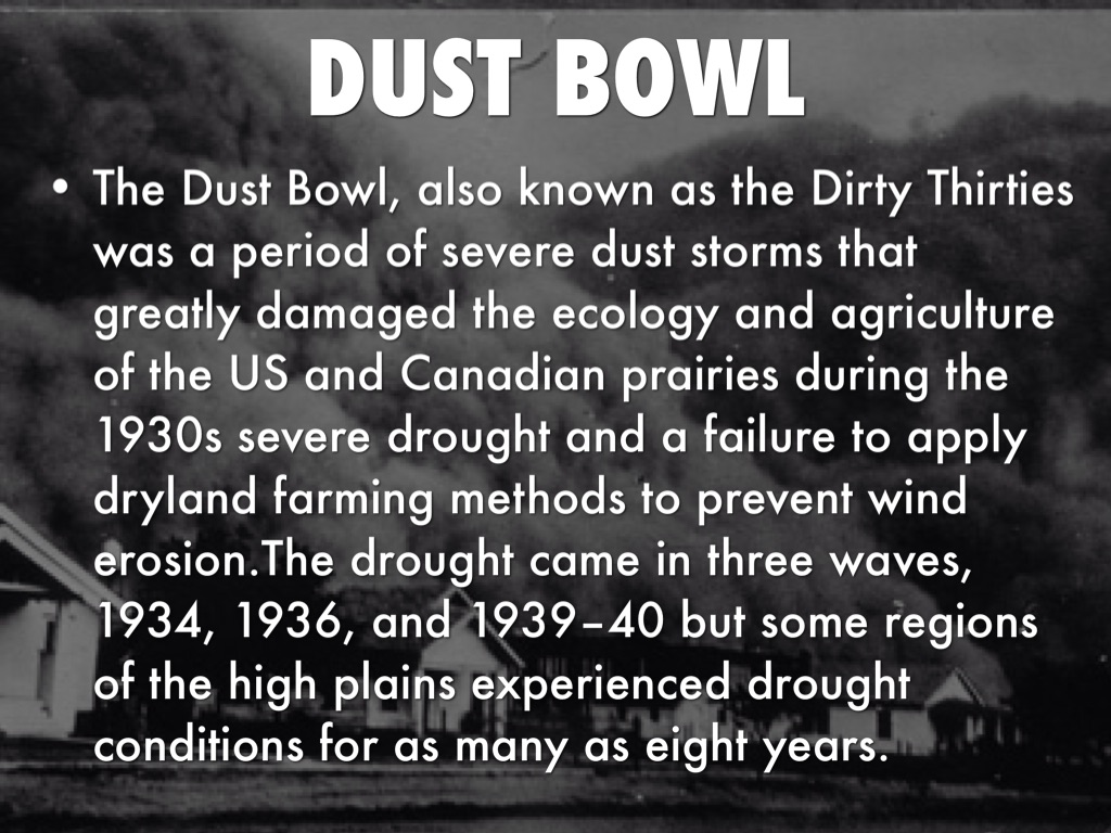 The Dust Bowl, also known as the Dirty Thirties was a period of severe dust storms that greatly damaged the ecology and agriculture of the US and Canadian prairies during the 1930s severe drought and a failure to apply dryland farming methods to prevent wind erosion.The drought came in three waves, 1934, 1936, and 1939–40 but some regions of the high plains experienced drought conditions for as many as eight years.