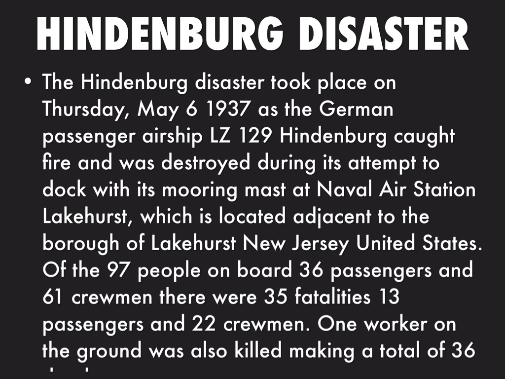 The Hindenburg disaster took place on Thursday, May 6 1937 as the German passenger airship LZ 129 Hindenburg caught fire and was destroyed during its attempt to dock with its mooring mast at Naval Air Station Lakehurst, which is located adjacent to the borough of Lakehurst New Jersey United States. Of the 97 people on board 36 passengers and 61 crewmen there were 35 fatalities 13 passengers and 22 crewmen. One worker on the ground was also killed making a total of 36 dead.
