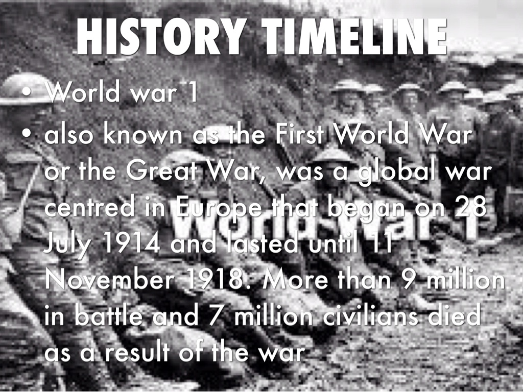 also known as the First World War or the Great War, was a global war centred in Europe that began on 28 July 1914 and lasted until 11 November 1918. More than 9 million in battle and 7 million civilians died as a result of the war