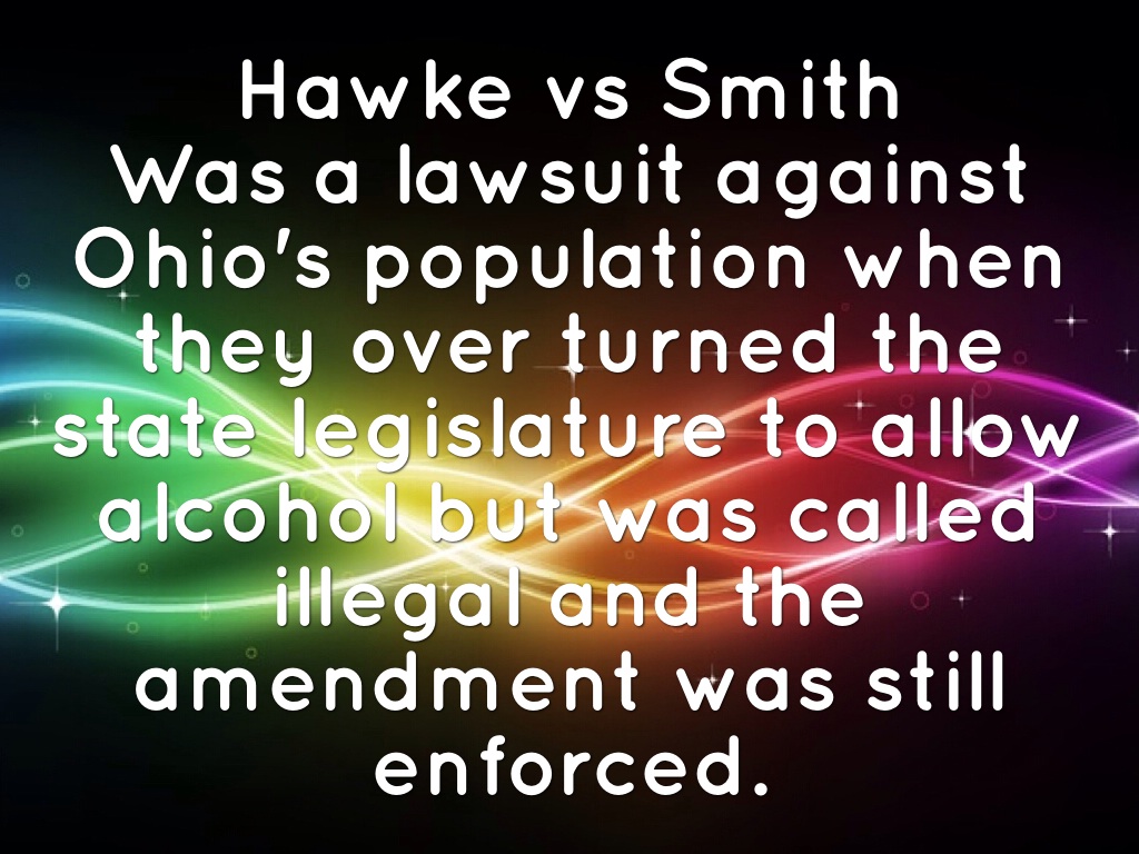 Hawke vs Smith Was a lawsuit against Ohio's population when they over turned the state legislature to allow alcohol but was called illegal and the amendment was still enforced.