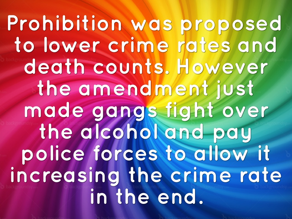 Prohibition was proposed to lower crime rates and death counts. However the amendment just made gangs fight over the alcohol and pay police forces to allow it increasing the crime rate in the end.