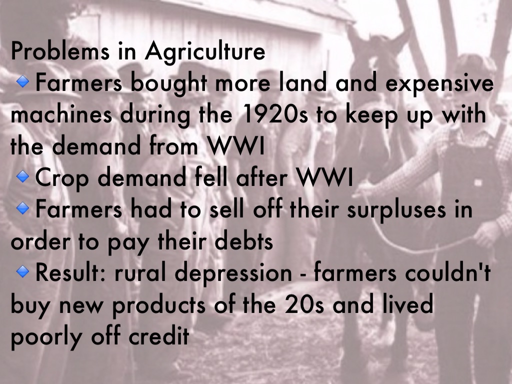 🔹Result: rural depression - farmers couldn't buy new products of the 20s and lived poorly off credit
