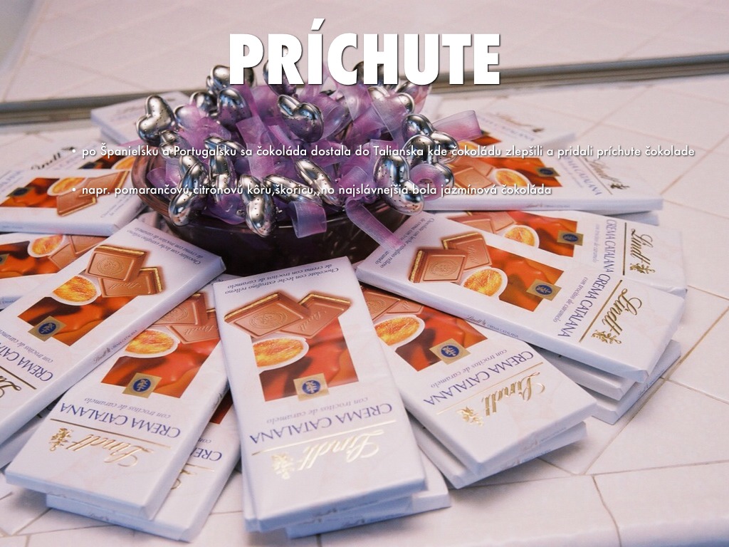 napr. pomarančovú,citrónovú kôru,škoricu,,no najslávnejšia bola jazmínová čokoláda