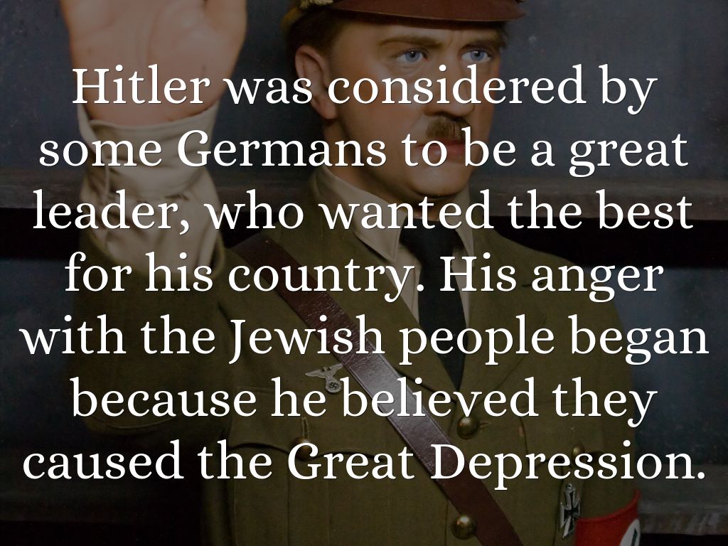 Hitler was considered by some Germans to be a great leader, who wanted the best for his country. His anger with the Jewish people began because he believed they caused the Great Depression.