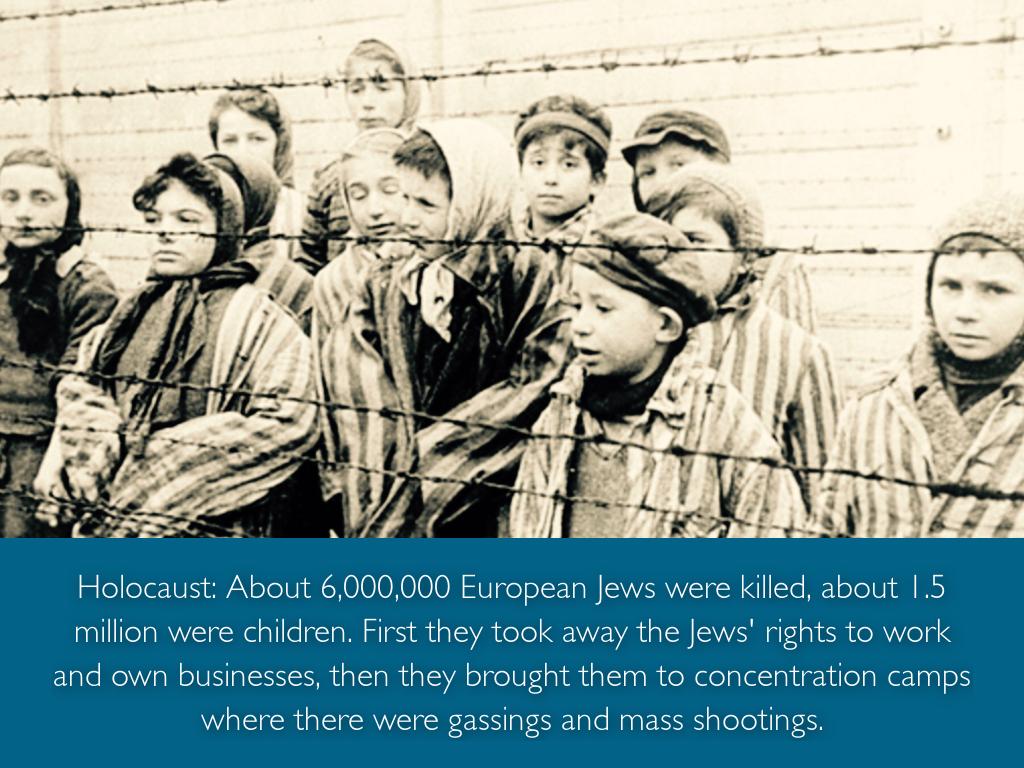 Holocaust: About 6,000,000 European Jews were killed, about 1.5 million were children. First they took away the Jews' rights to work and own businesses, then they brought them to concentration camps where there were gassings and mass shootings.