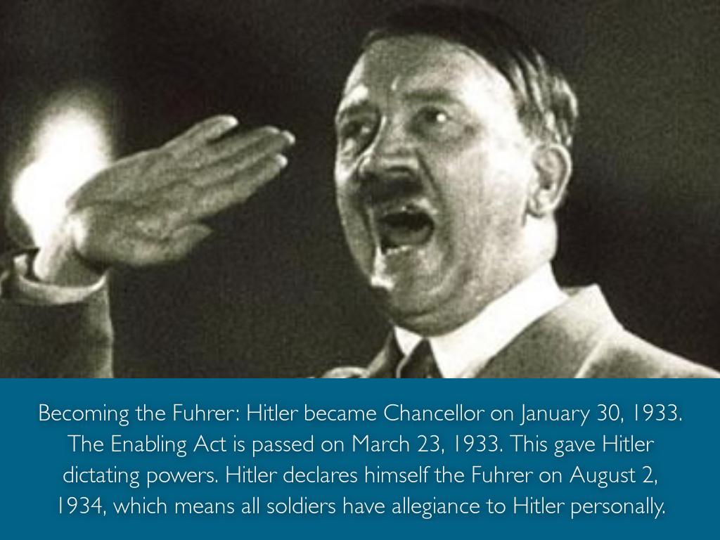 Becoming the Fuhrer: Hitler became Chancellor on January 30, 1933. The Enabling Act is passed on March 23, 1933. This gave Hitler dictating powers. Hitler declares himself the Fuhrer on August 2, 1934, which means all soldiers have allegiance to Hitler personally.
