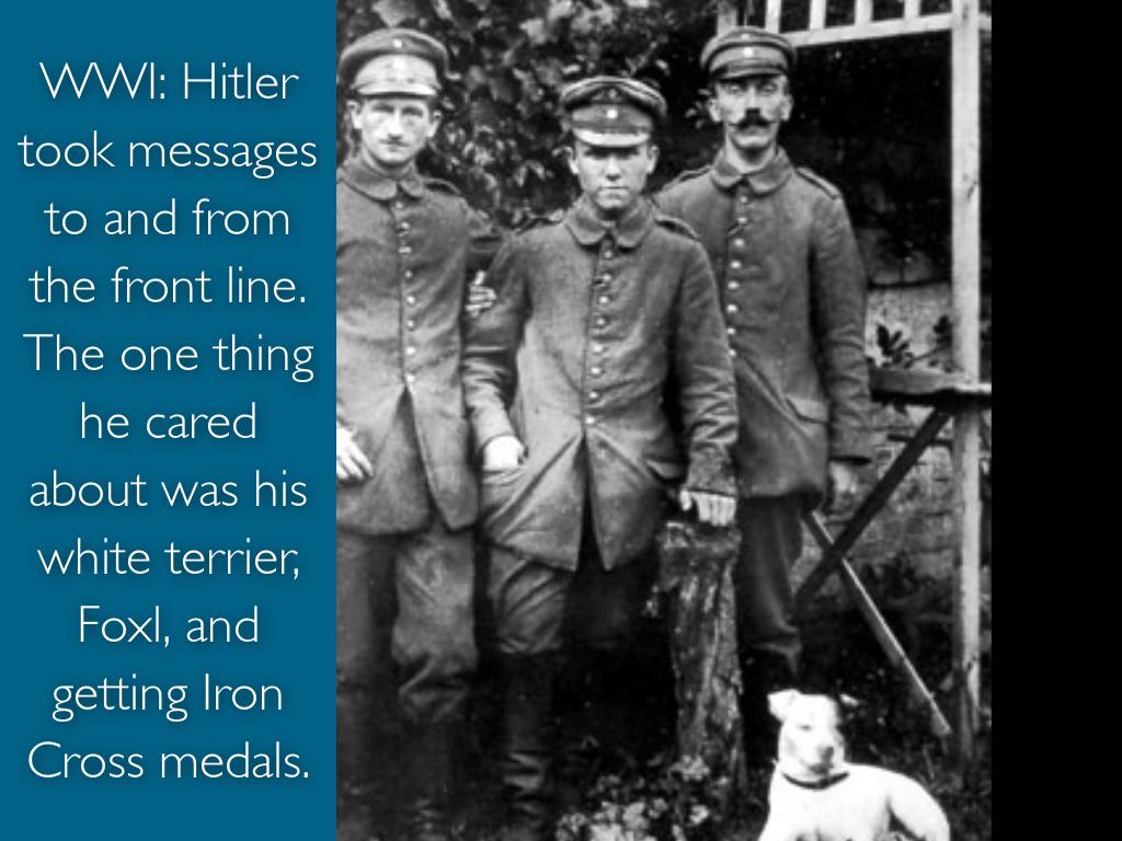 WWI: Hitler took messages to and from the front line. The one thing he cared about was his white terrier, Foxl, and getting Iron Cross medals.