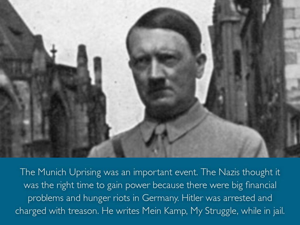 The Munich Uprising was an important event. The Nazis thought it was the right time to gain power because there were big financial problems and hunger riots in Germany. Hitler was arrested and charged with treason. He writes Mein Kamp, My Struggle, while in jail.