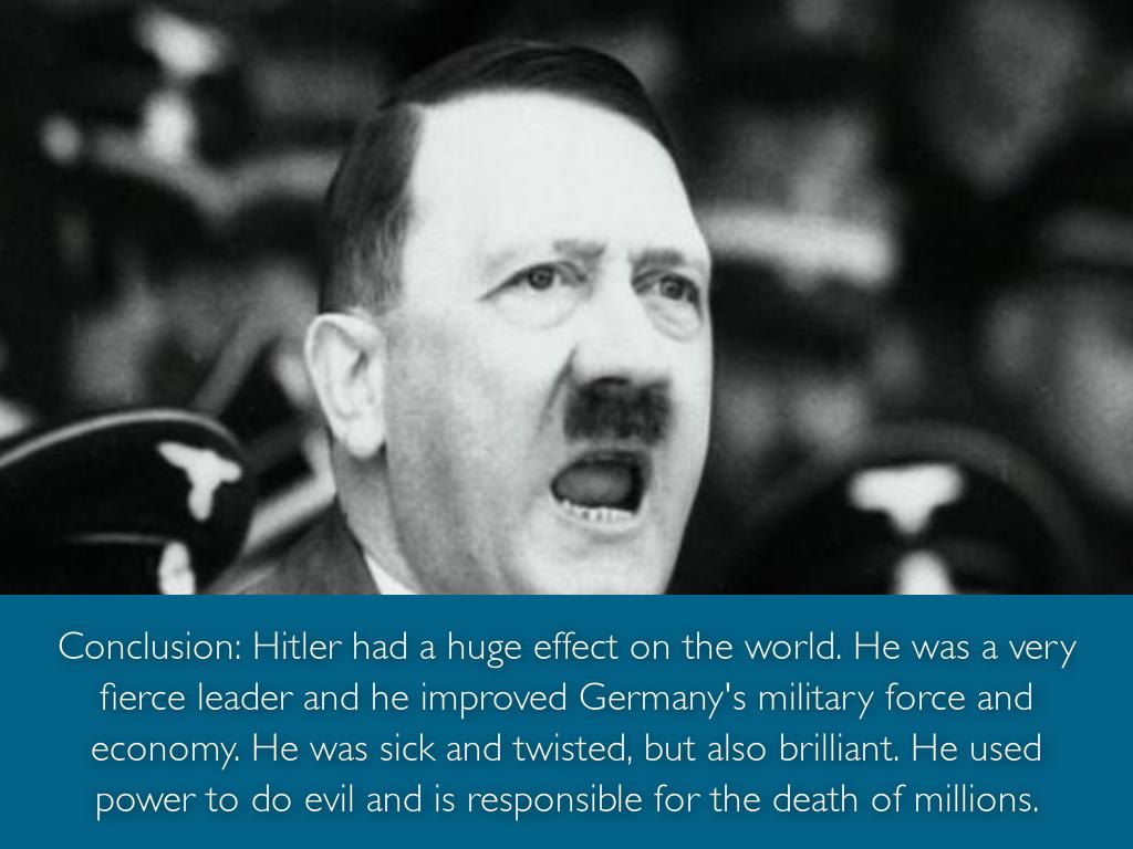 Conclusion: Hitler had a huge effect on the world. He was a very fierce leader and he improved Germany's military force and economy. He was sick and twisted, but also brilliant. He used power to do evil and is responsible for the death of millions.