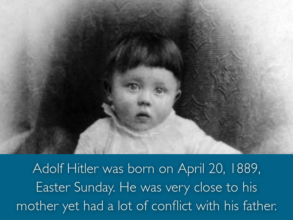 Adolf Hitler was born on April 20, 1889, Easter Sunday. He was very close to his mother yet had a lot of conflict with his father.