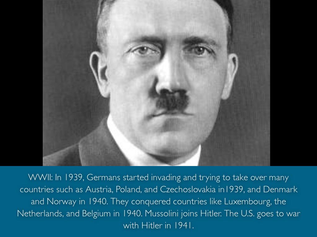 WWII: In 1939, Germans started invading and trying to take over many countries such as Austria, Poland, and Czechoslovakia in1939, and Denmark and Norway in 1940. They conquered countries like Luxembourg, the Netherlands, and Belgium in 1940. Mussolini joins Hitler. The U.S. goes to war with Hitler in 1941.