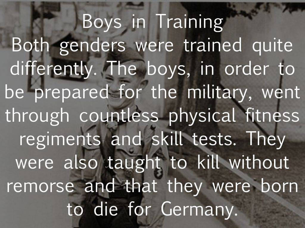 Both genders were trained quite differently. The boys, in order to be prepared for the military, went through countless physical fitness regiments and skill tests. They were also taught to kill without remorse and that they were born to die for Germany.