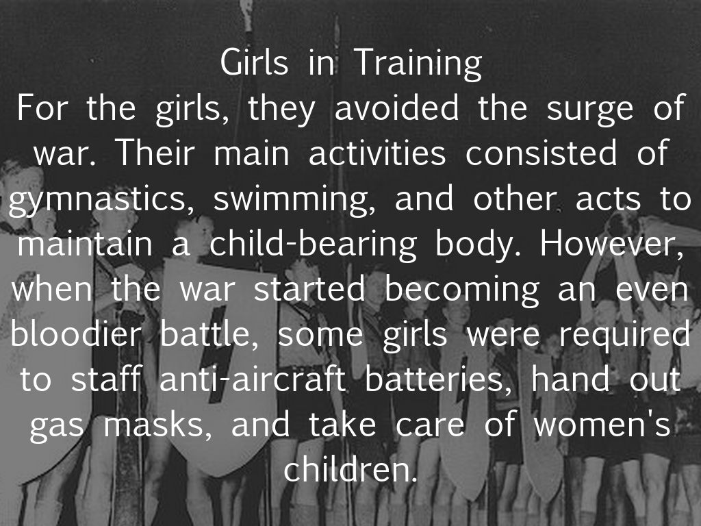 For the girls, they avoided the surge of war. Their main activities consisted of gymnastics, swimming, and other acts to maintain a child-bearing body. However, when the war started becoming an even bloodier battle, some girls were required to staff anti-aircraft batteries, hand out gas masks, and take care of women's children.