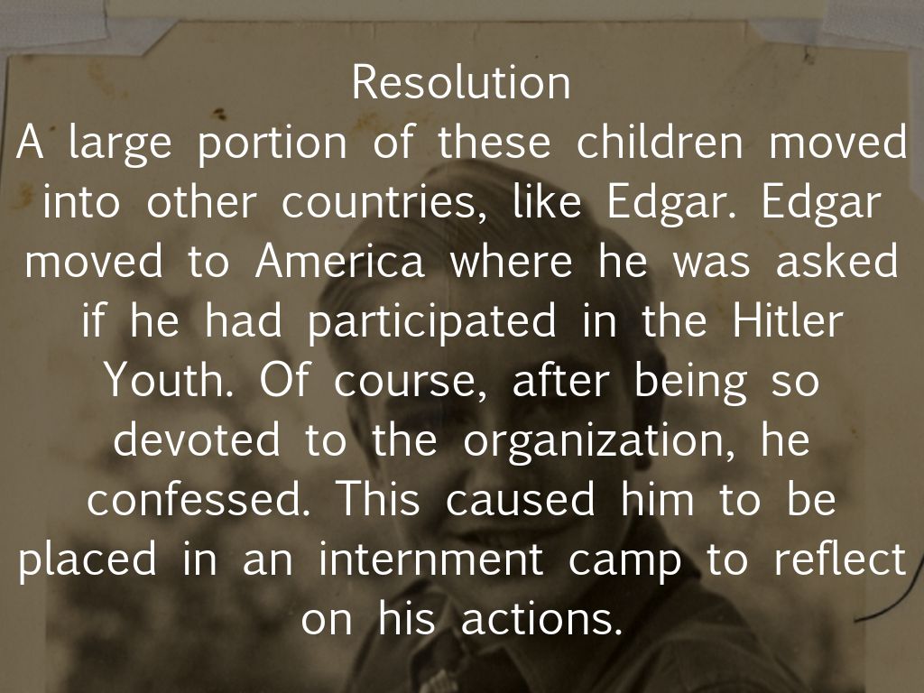 A large portion of these children moved into other countries, like Edgar. Edgar moved to America where he was asked if he had participated in the Hitler Youth. Of course, after being so devoted to the organization, he confessed. This caused him to be placed in an internment camp to reflect on his actions.