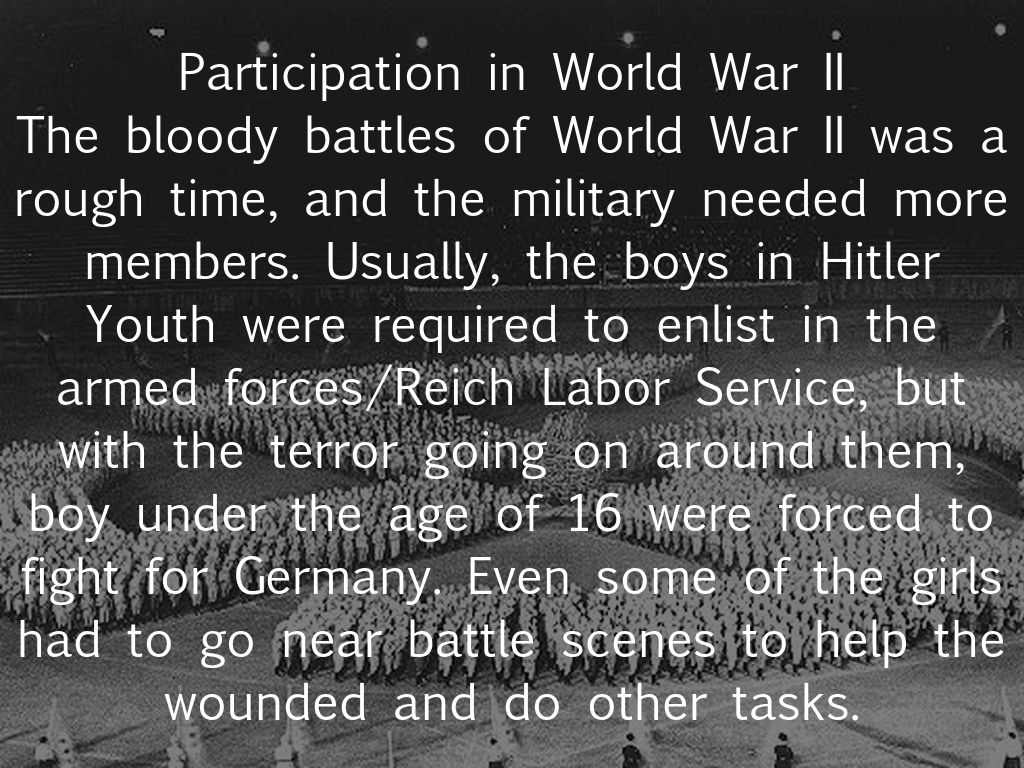 The bloody battles of World War II was a rough time, and the military needed more members. Usually, the boys in Hitler Youth were required to enlist in the armed forces/Reich Labor Service, but with the terror going on around them, boy under the age of 16 were forced to fight for Germany. Even some of the girls had to go near battle scenes to help the wounded and do other tasks.