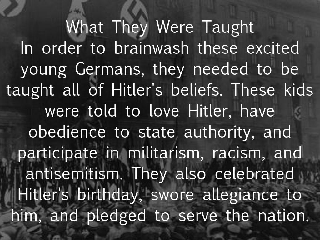 In order to brainwash these excited young Germans, they needed to be taught all of Hitler's beliefs. These kids were told to love Hitler, have obedience to state authority, and participate in militarism, racism, and antisemitism. They also celebrated Hitler's birthday, swore allegiance to him, and pledged to serve the nation.