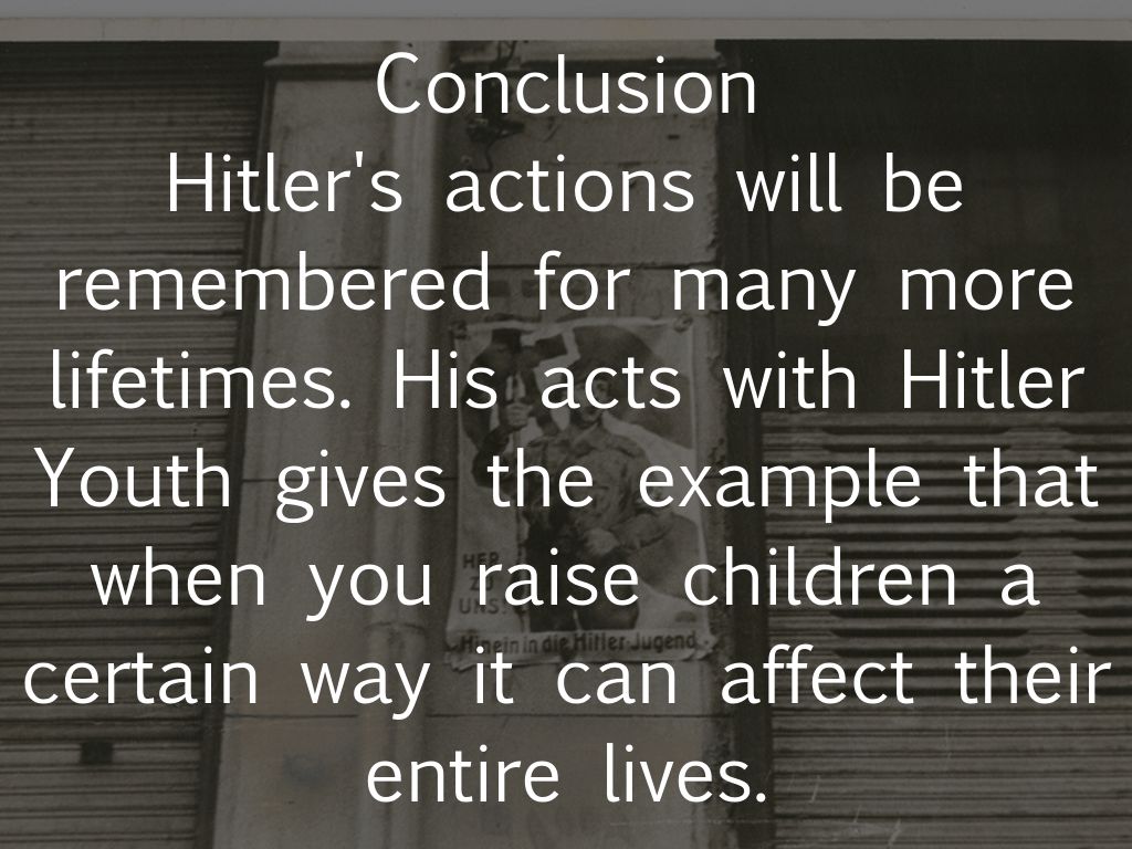 Hitler's actions will be remembered for many more lifetimes. His acts with Hitler Youth gives the example that when you raise children a certain way it can affect their entire lives.