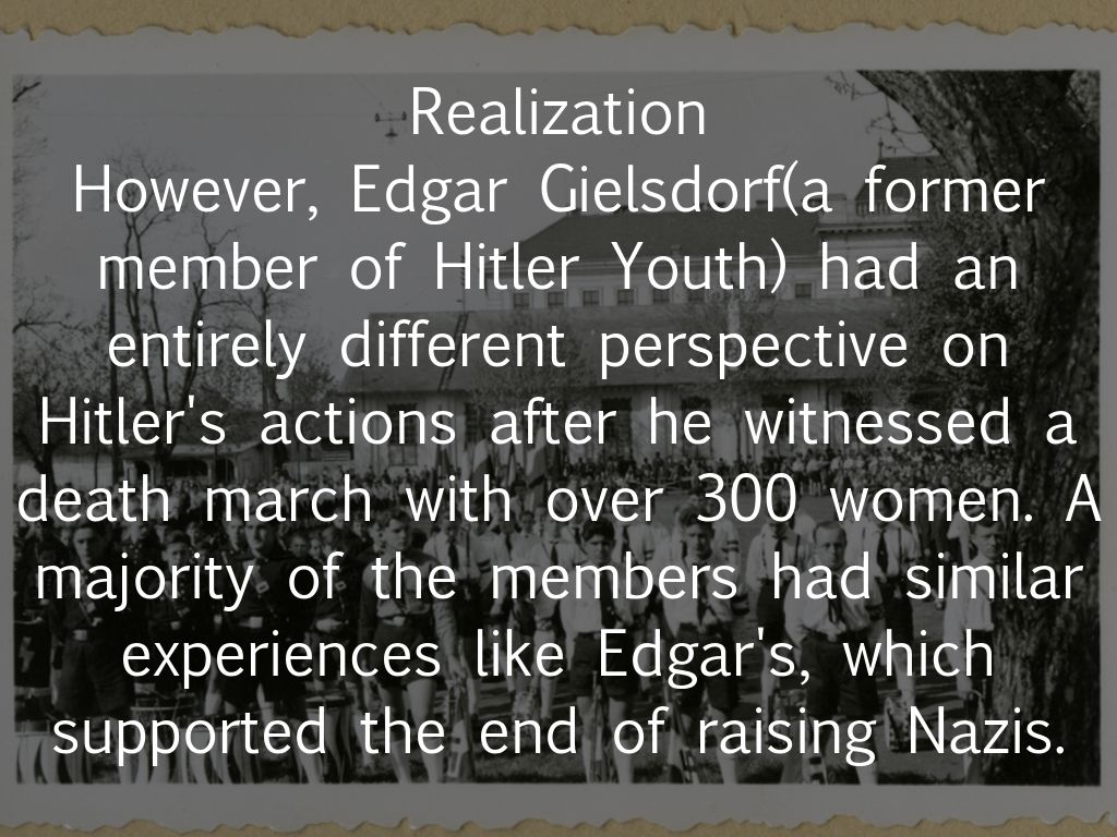 However, Edgar Gielsdorf(a former member of Hitler Youth) had an entirely different perspective on Hitler's actions after he witnessed a death march with over 300 women. A majority of the members had similar experiences like Edgar's, which supported the end of raising Nazis.