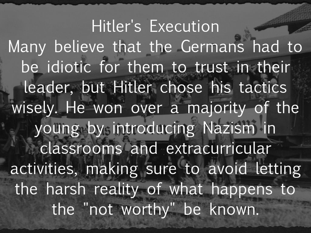 Many believe that the Germans had to be idiotic for them to trust in their leader, but Hitler chose his tactics wisely. He won over a majority of the young by introducing Nazism in classrooms and extracurricular activities, making sure to avoid letting the harsh reality of what happens to the "not worthy" be known.