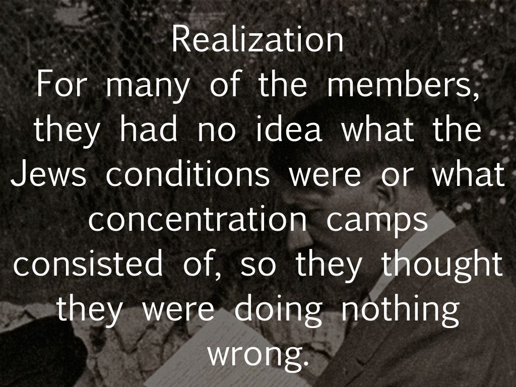 For many of the members, they had no idea what the Jews conditions were or what concentration camps consisted of, so they thought they were doing nothing wrong.