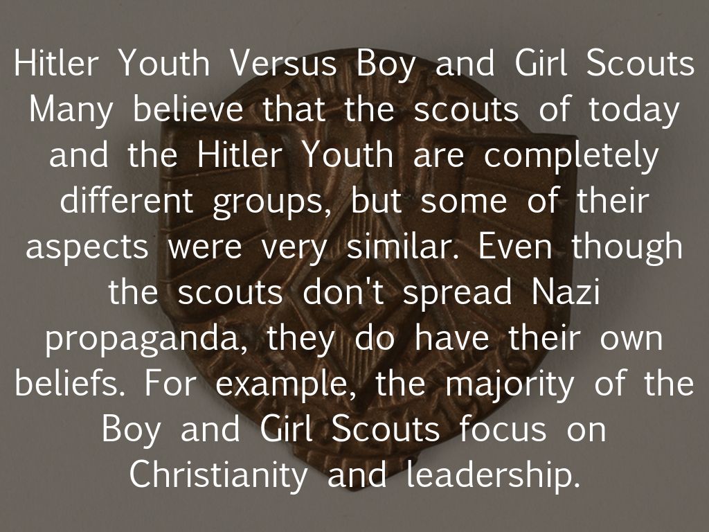 Many believe that the scouts of today and the Hitler Youth are completely different groups, but some of their aspects were very similar. Even though the scouts don't spread Nazi propaganda, they do have their own beliefs. For example, the majority of the Boy and Girl Scouts focus on Christianity and leadership.