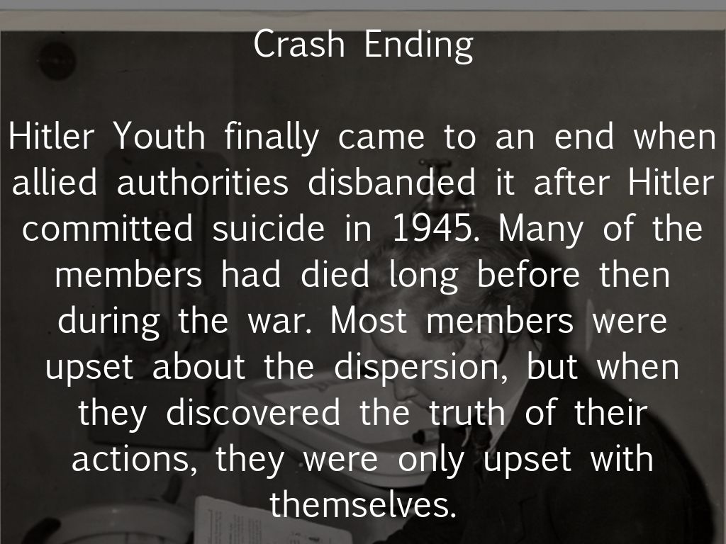 Hitler Youth finally came to an end when allied authorities disbanded it after Hitler committed suicide in 1945. Many of the members had died long before then during the war. Most members were upset about the dispersion, but when they discovered the truth of their actions, they were only upset with themselves.