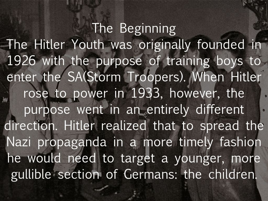 The Hitler Youth was originally founded in 1926 with the purpose of training boys to enter the SA(Storm Troopers). When Hitler rose to power in 1933, however, the purpose went in an entirely different direction. Hitler realized that to spread the Nazi propaganda in a more timely fashion he would need to target a younger, more gullible section of Germans: the children.