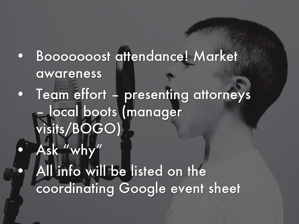 Team effort – presenting attorneys – local boots (manager visits/BOGO)