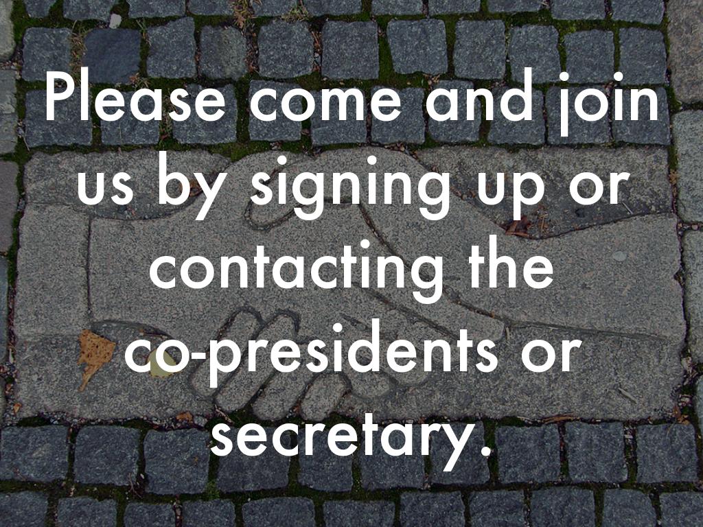 Please come and join us by signing up or contacting the co-presidents or secretary.