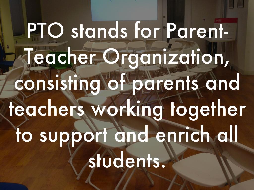 PTO stands for Parent-Teacher Organization, consisting of parents and teachers working together