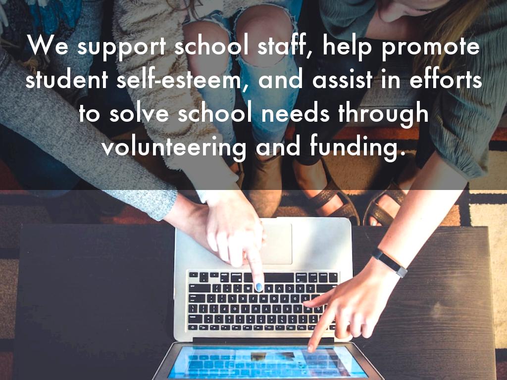 We support school staff, help promote student self-esteem, and assist in efforts to solve school needs through volunteering and funding.