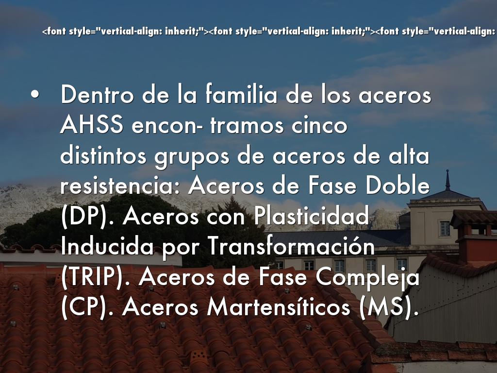• Dentro de la familia de los aceros AHSS encon- tramos cinco distintos grupos de aceros de alta resistencia: Aceros de Fase Doble (DP). Aceros con Plasticidad Inducida por Transformación (TRIP). Aceros de Fase Compleja (CP). Aceros Martensíticos (MS).