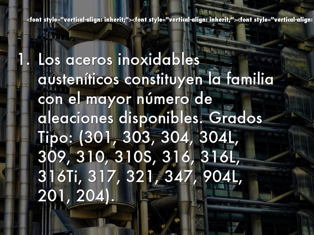 • Los aceros inoxidables austeníticos constituyen la familia con el mayor número de aleaciones disponibles. Grados Tipo: (301, 303, 304, 304L, 309, 310, 310S, 316, 316L, 316Ti, 317, 321, 347, 904L, 201, 204).