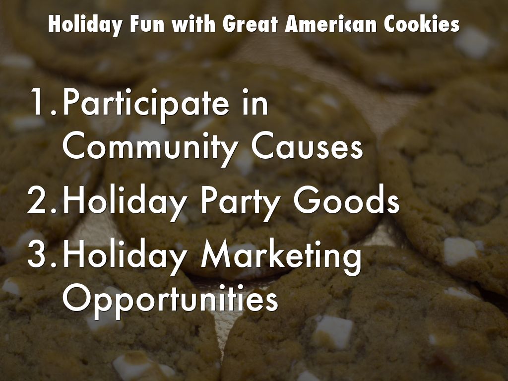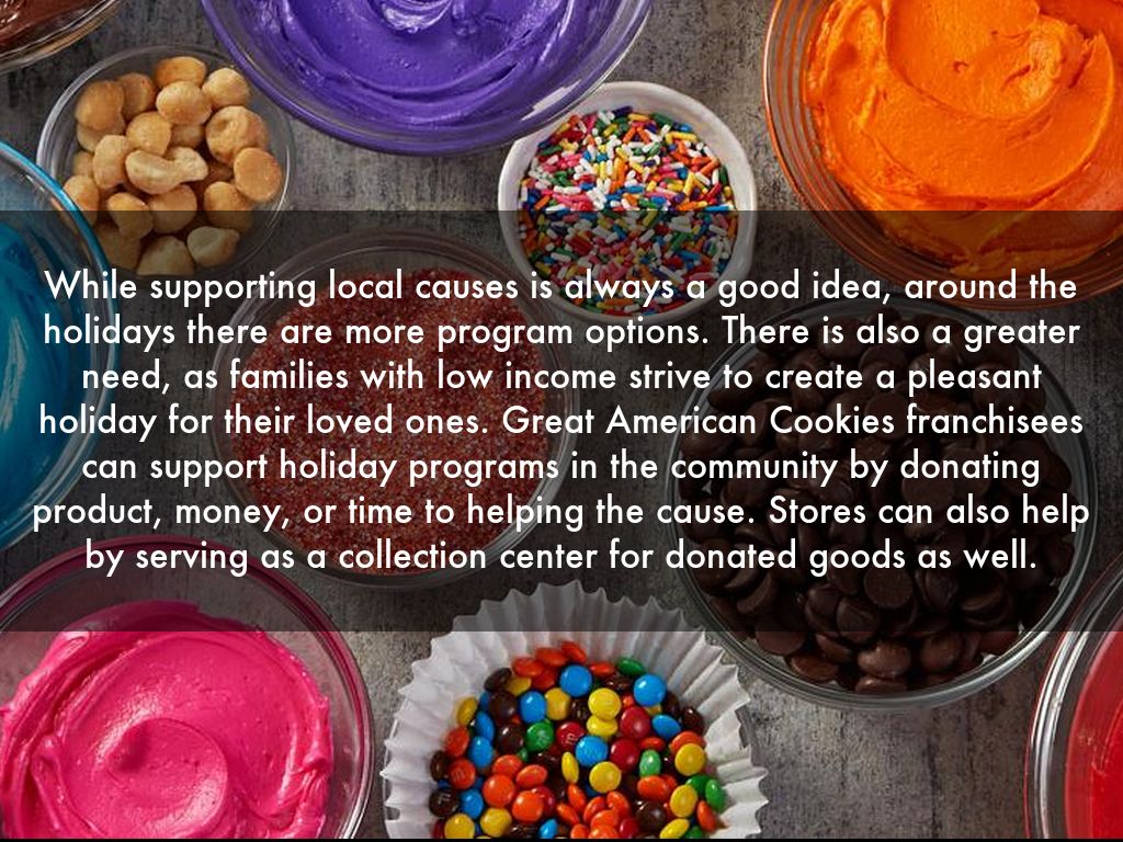 While supporting local causes is always a good idea, around the holidays there are more program options. There is also a greater need, as families with low income strive to create a pleasant holiday for their loved ones. Great American Cookies franchisees can support holiday programs in the community by donating product, money, or time to helping the cause. Stores can also help by serving as a collection center for donated goods as well.