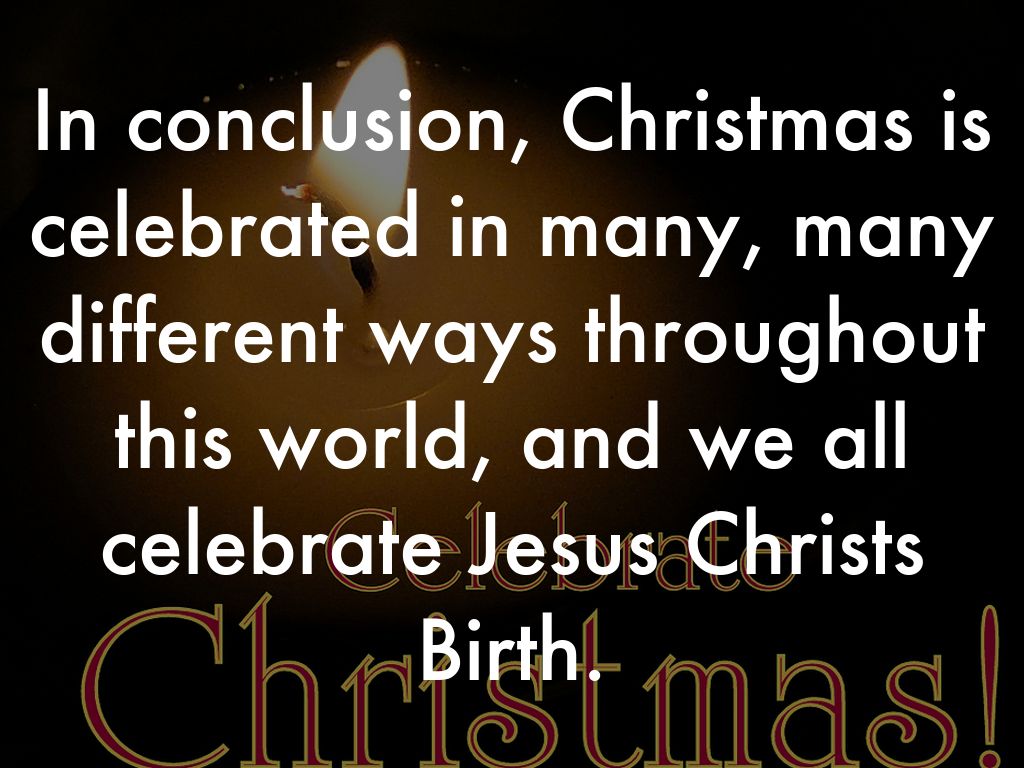 In conclusion, Christmas is celebrated in many, many different ways throughout this world, and we all celebrate Jesus Christs Birth.