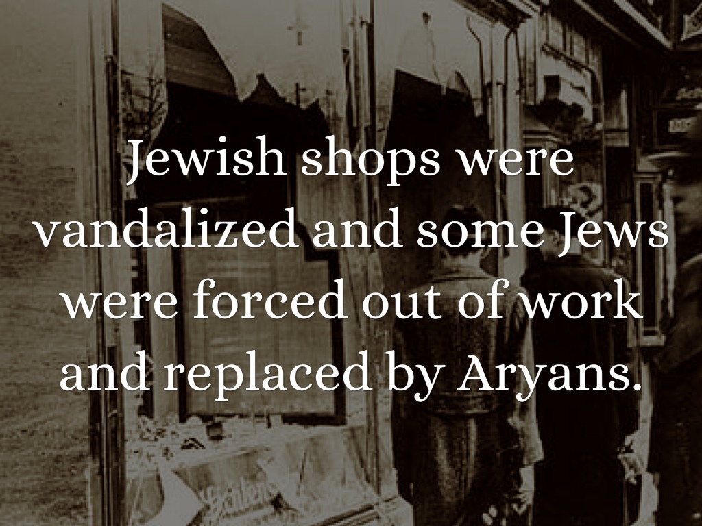 Jewish shops were vandalized and some Jews were forced out of work and replaced by Aryans.