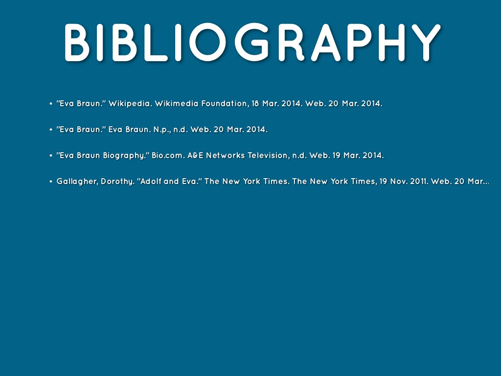 - "Eva Braun." Eva Braun. N.p., n.d. Web. 20 Mar. 2014.